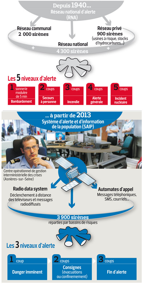 Les sirènes des villes, qui retentissent trois fois, tous les premiers mercredi du mois, pour s'assurer de leur bon fonctionnement, ont pris un sérieux coup de vieux. Installées en 1940 pour les besoins de la Défense civile, elles vont enfin recevoir un mode d'emploi digne de ce nom. Et seront même secondées par des automates qui diffuseront des messages télé et radio, mais aussi des SMS et des courriels directement chez les particuliers afin que chacun sache quelle conduite adopter selon le type d'incident.