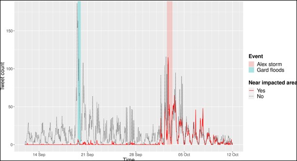 L’évaluation du modèle développé est présenté dans un récent article publié dans la revue PLOS One. L’article présente les résultats du modèle IA développé sur le cas de la tempête Alex ayant sérieusement touché les Alpes-Maritimes en octobre 2020. L’évaluation des performances du modèle a pu se faire grâce à une collaboration mise en place durant plus d’un an entre les membres de RéSoCIO travaillant au BRGM et l’équipe-projet « Veille des réseaux sociaux » côté Météo-France. En croisant les données issues des réseaux de mesure météorologique avec les résultats du modèle d’IA, des concentrations de tweets récupérés apparaissent dans les zones les plus touchées. Ce résultat est extrêmement prometteur pour la suite des travaux témoignant de bonnes performances du modèle développé.