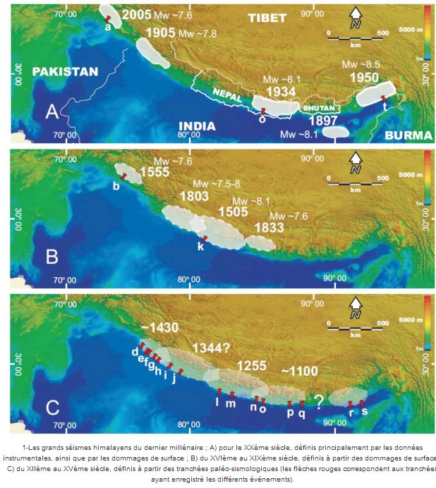 Des travaux réalisés par des équipes françaises en collaboration avec des chercheurs Indiens et Népalais depuis 1995 a été publiée en ligne dans la revue « Earth and Planetary Science Review » le 19 septembre dernier nous apprend que durant le dernier millénaire, toute l’énergie élastique générée par la convergence Inde-Tibet a été relâchée via une quinzaine de grands séismes. Leur chronologie irrégulière et leurs surfaces de rupture se superposant partiellement suggèrent que l’énergie emmagasinée entre deux tremblements de terre n’est pas totalement relâchée à chaque grand séisme.