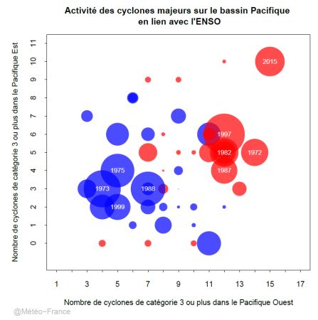 Outre, les sécheresses en Amériques centrale / Afrique Australe, les pluies diluviennes sur l'Ouest de l'Amrique du Sud, le phénomène El Niño, impacte également l'activité cyclonique à l'échelle planétaire : certaines zones océaniques enregistrent une activité plus faible que la normale alors que d'autres, comme le bassin Pacifique, connaissent des cyclones particulièrement dévastateurs.