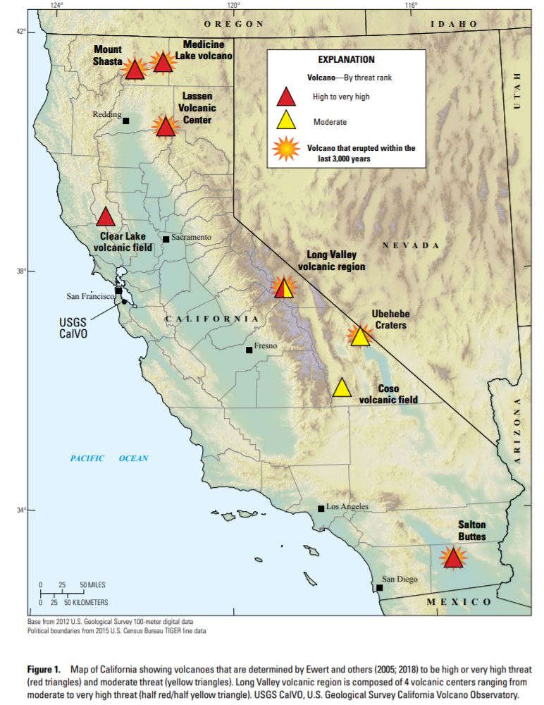 Les risques de tremblements de terre, de glissements de terrain, d'inondations, de tsunamis et de feux de forêt sont largement reconnus en Californie. On ne peut pas en dire autant des éruptions volcaniques, même si elles se produisent dans cet État aussi souvent que les plus grands tremblements de terre sur la faille de San Andreas. Au moins dix éruptions ont eu lieu au cours des 1 000 dernières années et les futures éruptions volcaniques sont inévitables.