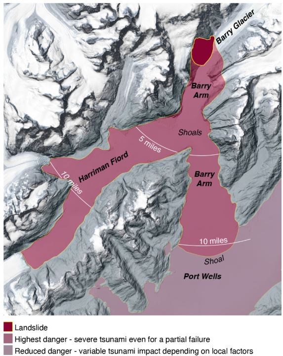 L'effondrement d'un pan de montagne instable en Alaska pourrait déclencher un tsunami catastrophique dans le fjord Harriman. Une lettre ouverte signée par 14 experts en glissements de terrain, tsunamis et changements climatiques décrit une pente de montagne instable au-dessus du bord d'attaque du glacier Barry en retraite en Alaska.