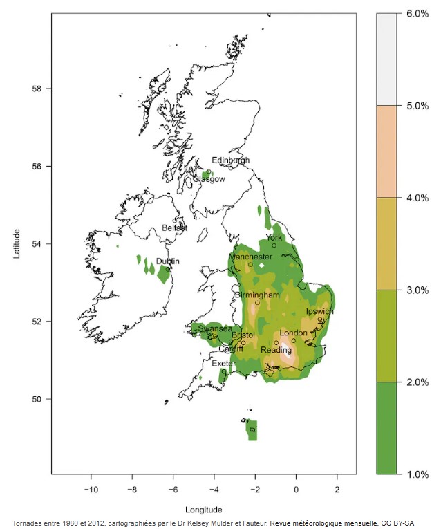 On associe souvent (à juste titre) les tornades aux plaines du centre des États-Unis, mais elles sont étonnamment courantes au Royaume-Uni aussi, bien que plus petites et plus faibles. En fait, la doctorante Kelsey Mulder a découvert que le Royaume-Uni compte environ 2,3 tornades par an pour 10 000 kilomètres carrés.