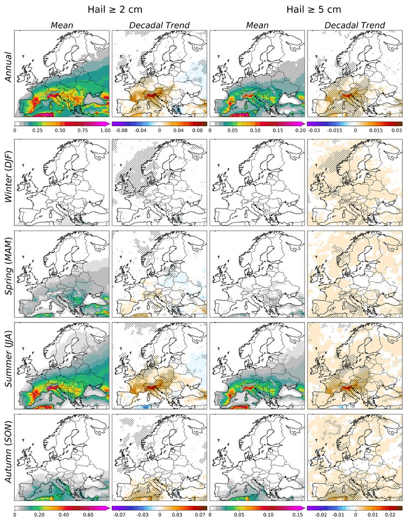 Dans l’étude menée par l’ESSL, de l’Université Adam Mickiewicz, du NSSL et de la Freie Universität Berlin, rédigée par Francesco Battaglioli, chercheur à l’ESSL des chercheurs ont reconstruit la climatologie de la foudre et de la (très) grosse grêle en Europe et en Amérique du Nord depuis 1950 à l’aide de modèles statistiques (AR-CHaMo) entraînés avec environ 24 millions d’observations de foudre et plus de 44000 rapports de grêle.