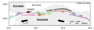 La faille nord-anatolienne, responsable de tremblements de terre destructeurs en 1999 en Turquie, est comparable à la faille de San Andreas en Californie. Elle constitue la limite des plaques tectoniques eurasiatique et anatolienne, qui se déplacent l’une par rapport à l’autre d’environ 2 cm par an.