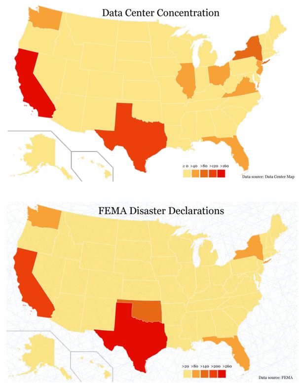 Le rapprochement des cartes américaines des risques naturels et des implantations de datacenters montrent une très grande exposition de ces derniers ce qui n'est pas sans poser de question sur la vulnérabilité des données stockées dans ces fermùes de serveurs à leur ou les services basés sur le cloud computing explose.