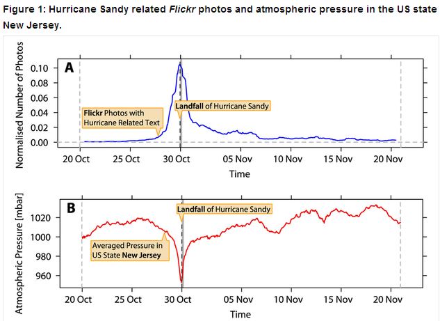 L'analyse des différentes photos mise en ligne durant l'ouragan Sandy a permis de faire émerger son évolution et d'en quantifier l'importance en termes de dégâts, indicateur qui pourrait s'avérer précieux dans les zones pauvres en capteurs dédiés.