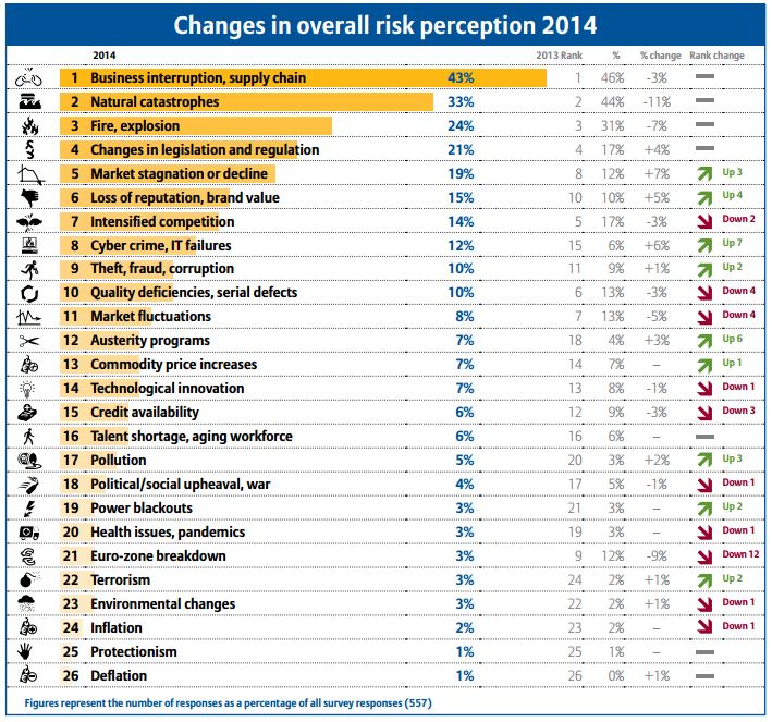 Le troisième baromètre des risques réalisé par Allianz Global Corporate & Specialty indique que les catastrophes naturelles arrivent en seconde position dans le classement des risques redoutés pour 2014 par les entreprises, immédiatement après l'interruption de la chaîne logistique.