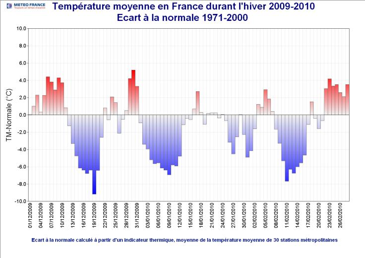 L’hiver « climatologique » (décembre-janvier-février) 2009-2010 a été froid, fréquemment neigeux et globalement peu ensoleillé. Avec une température moyenne sur la France située 1,2 °C sous la normale saisonnière, l’hiver 2009-2010 se positionne parmi les hivers froids, mais non exceptionnels, de ces dernières années.