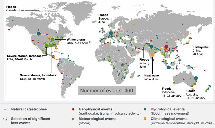 Le coût à supporter pour l’ensemble des assureurs a atteint quelque 13 milliards de dollars (environ 10 milliards d’euros) de janvier à fin juin, sur un total de 45 milliards de dollars. En moyenne, le coût se situe habituellement autour de 22 milliards de dollars sur la même période depuis dix ans, a précisé le groupe de Munich dans un communiqué .