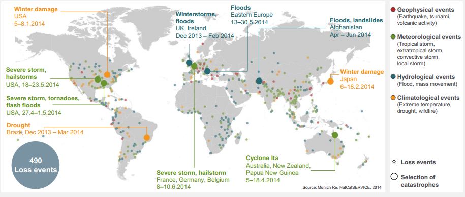 Alors que le puissant typhon Neoguri se dirigeait mercredi vers les îles principales de l’archipel japonais, le traditionnel bilan à mi-année fait par Munich Ré , note que, pour l’instant les catastrophes naturelles ont coûté moins cher en 2014 que les années précédentes.