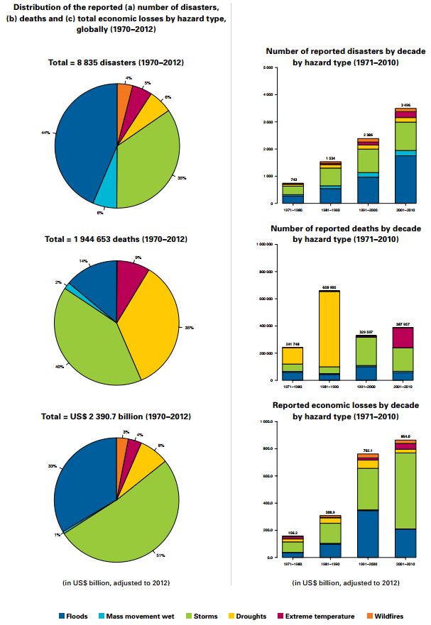 Publié conjointement par l'Organisation météorologique mondiale (OMM) et le Centre de recherche sur l'épidémiologie des désastres (CRED) de l'Université catholique de Louvain (UCL), en Belgique, l'Atlas de la mortalité et des pertes économiques dues aux phénomènes météorologiques, climatiques et hydrologiques extrêmes (1970–2012) (The Atlas of Mortality and Economic Losses from Weather, Climate and Water Extremes 1970-2012) décrit la répartition géographique et les conséquences des catastrophes liées au temps, au climat et à l'eau, en soulignant les mesures susceptibles d'être prises pour renforcer notre résilience.