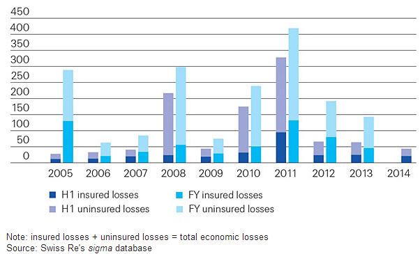 D’après un rapport du réassureur Swiss Re, les catastrophes naturelles ont causé pour 41 milliards de dollars de dégâts au premier semestre 2014. Les assureurs vont débourser 19 milliards de dollars, contre 21 milliards au premier semestre 2013.
