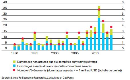 Selon une étude du réassureur helvétique Swiss Re publiée mercredi, les dommages liés aux tempêtes orageuses sévères sont orientés à la hausse depuis vingt-cinq ans, qui souligne que ce type de catastrophe est de plus en plus coûteux.