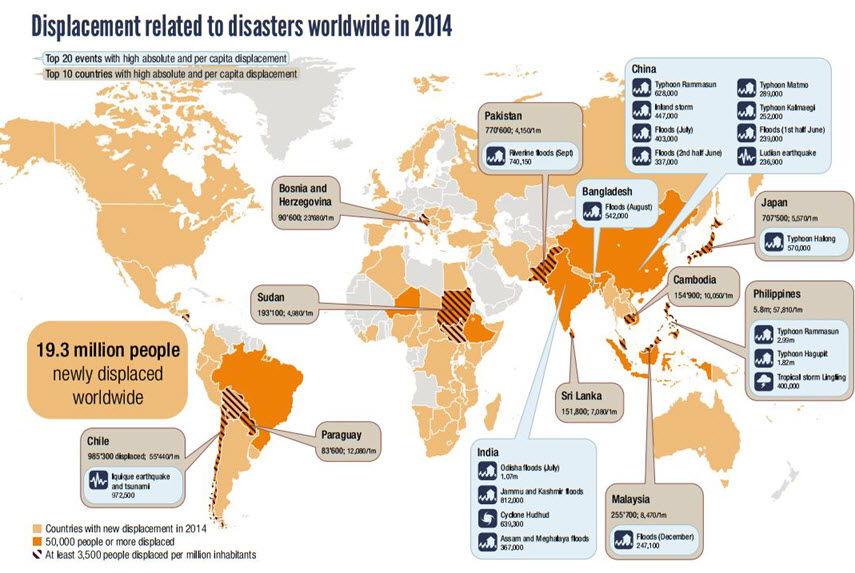 Selon le dernier rapport de l’Observatoire des situations de déplacements internes (IDMC) du Conseil norvégien pour les réfugiés, en 2014, 19,3 millions de personnes ont été obligées de fuir leur foyer en raison de catastrophes liées aux aléas naturels.