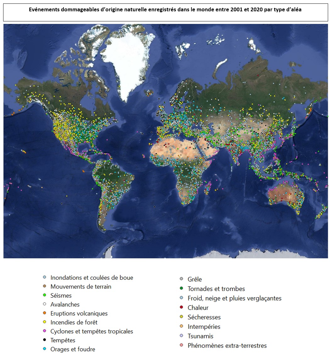 Entre le 1er janvier 2001 et le 31 décembre 2020, pas moins de 18 142 événements naturels dommageables se sont produit dans le monde, causant la mort directe ou indirecte de 1 354 792 personnes et occasionnant un coût estimé de 3 443 milliards de $ de dommages (coût total actualisé de l'inflation annuelle). Ces chiffres cachent cependant une évolution à long terme qui peut sembler surprenante puisque les événements enregistrés ces 20 dernières années font apparaître, par rapport aux 20 années précédentes (1981-2000) : une augmentation de la fréquence globale des événements, une baisse de la fréquence des événements graves, une baisse de leurs conséquences humaines mais une hausse sensible de leurs conséquences économiques.