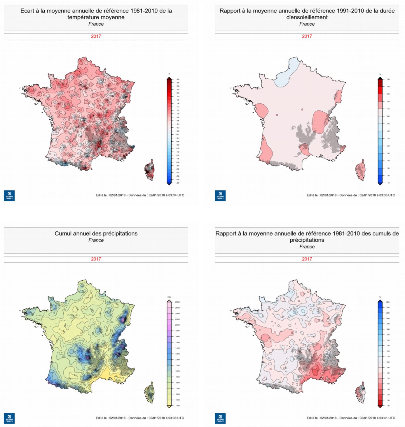 2017 se caractérise par des températures élevées et un fort déficit de précipitations, ce qui en fait, à l'instar de 2003, 2011 et 2015, une des années associant de manière remarquable chaleur et sécheresse sur la période 1959-2017.