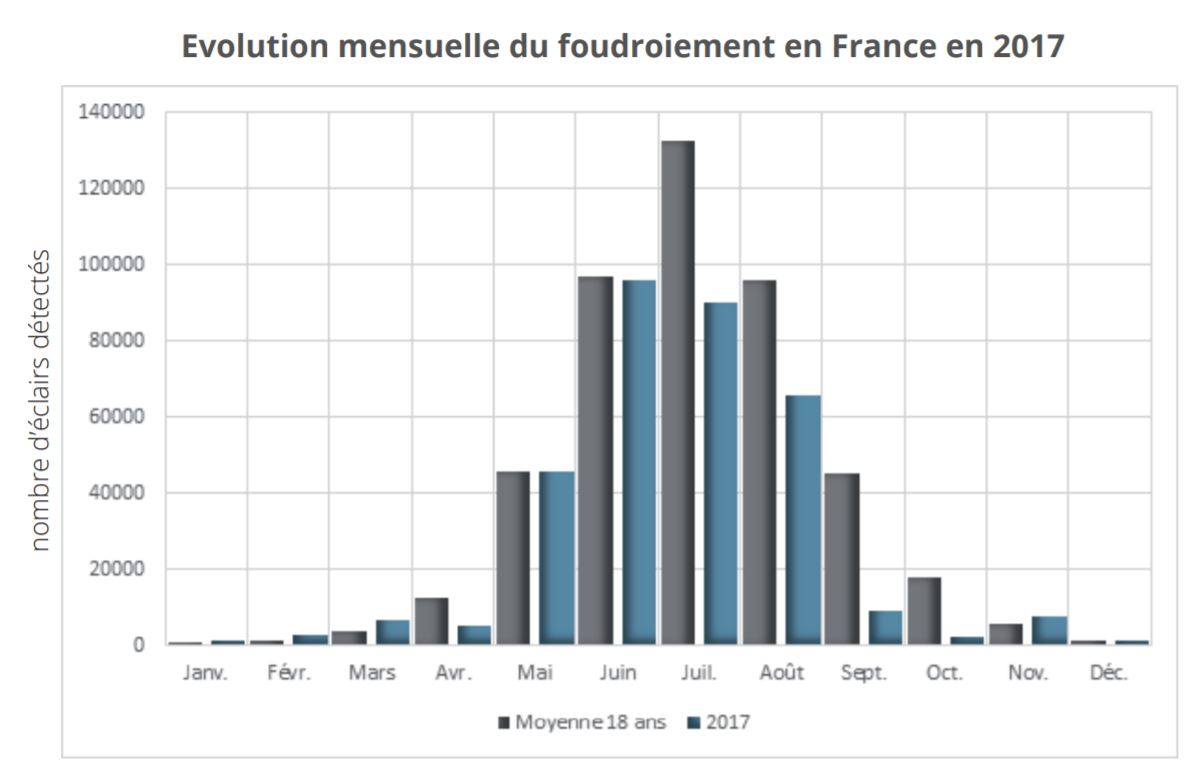 Dans son bilan annuel, le réseau de détection des éclairs, Météorage, a répertorié en 2017 en France près de 1 375 000 éclairs dont 333 500 éclairs Nuage-Sol. Malgré ce nombre impressionnant, l'année 2017 a été une année de faible activité de foudroiement.