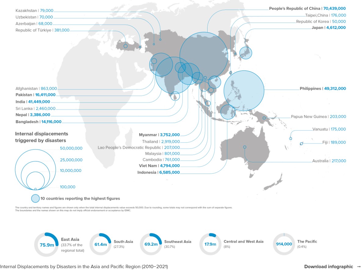 Pour la seule région de l'Asie-Pacifique, le nombre de personnes déplacées en raison de catastrophes climatiques et naturelles a dépassé les 225 millions au cours des 10 dernières années, selon une étude de la Banque asiatique de développement et de l'IDMC.