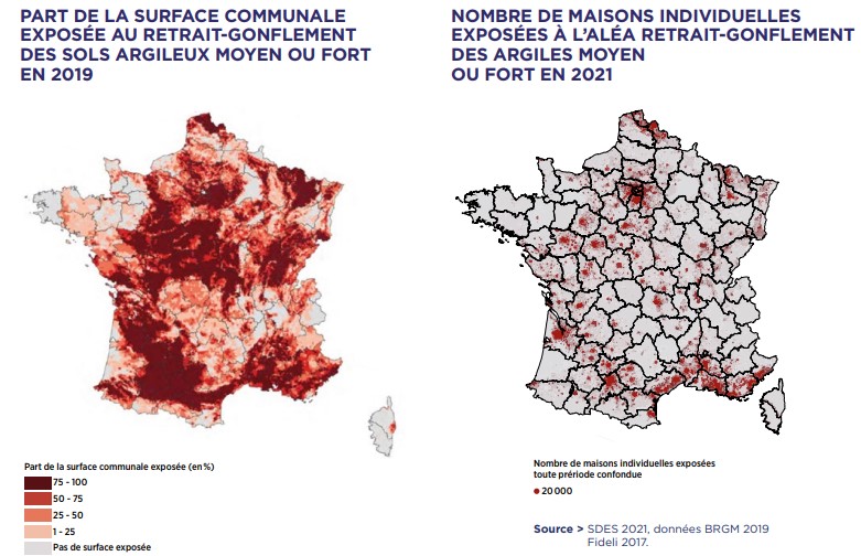 En France métropolitaine, 16,2 % des maisons individuelles sont fortement concernées par le risque sécheresse lié au phénomène de retrait-gonflement des argiles (risque RGA « fort »).