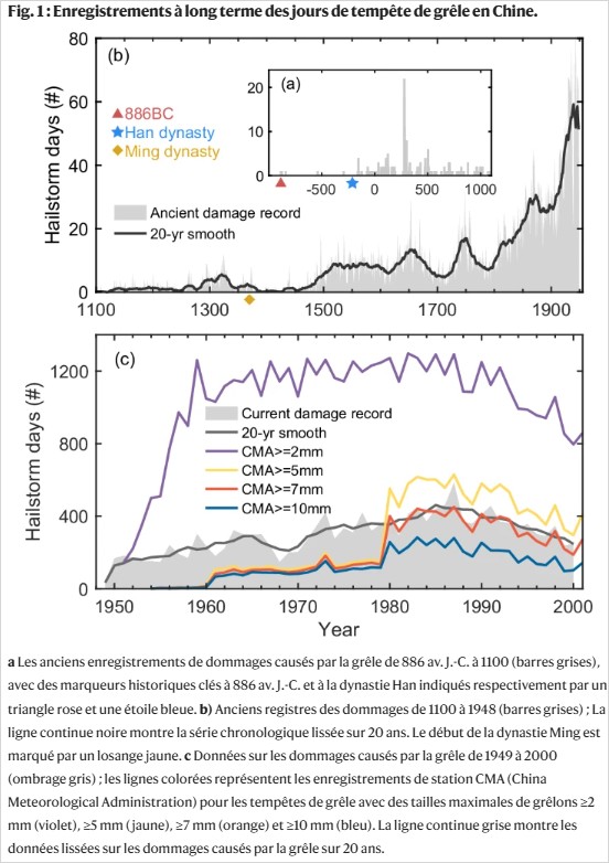 Des travaux menés par ces chercheurs chinois et publiés dans la revue Nature Communication étudient l’évolution des occurrences de grêle en Chine sur une période d’environ trois millénaires, en utilisant des archives historiques et des techniques modernes de modélisation climatique afin de retracer la fréquence des jours de grêle jusqu’à 2890 ans en arrière et d’en projeter les tendances futures à l’ère du réchauffement climatique.