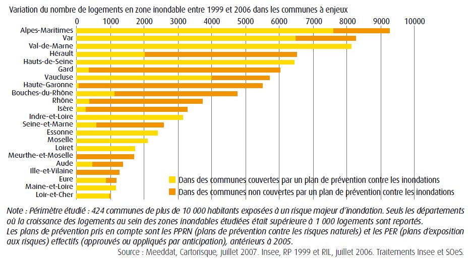D'après une étude rendue publique par le Commissariat général au développement durable basée sur une étude de l'INSEE et du Service de l'observation et des statistiques, près de 100 000 logements supplémentaires ont été construits sur des zones potentiellement inondables entre 1999 et 2006.