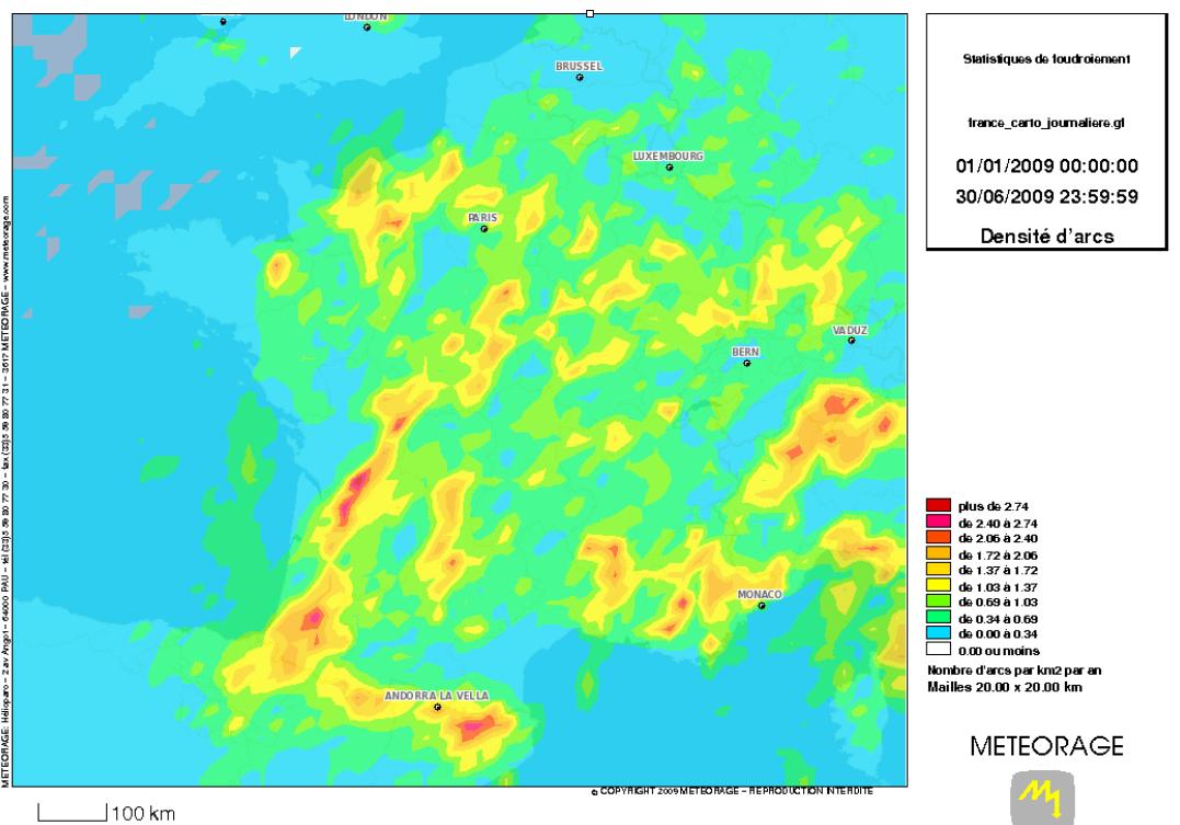 Le premier semestre de l’année 2009 affiche un niveau de foudroiement parmi les plus importants de ces 10 dernières années. En effet, le réseau de détection de la foudre de Météorage a enregistré au cours des 6 premiers mois, environ 192000 éclairs nuage-sol sur le territoire métropolitain.