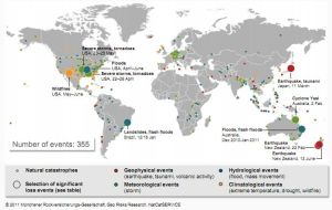 Selon un rapport publié par le réassureur allemand Munich Re, l'accumulation exceptionnelle de catastrophes naturelles au premier semestre 2011 a provoqué des pertes économiques de 265 milliards de dollars US (191 millions d'euros), un record.